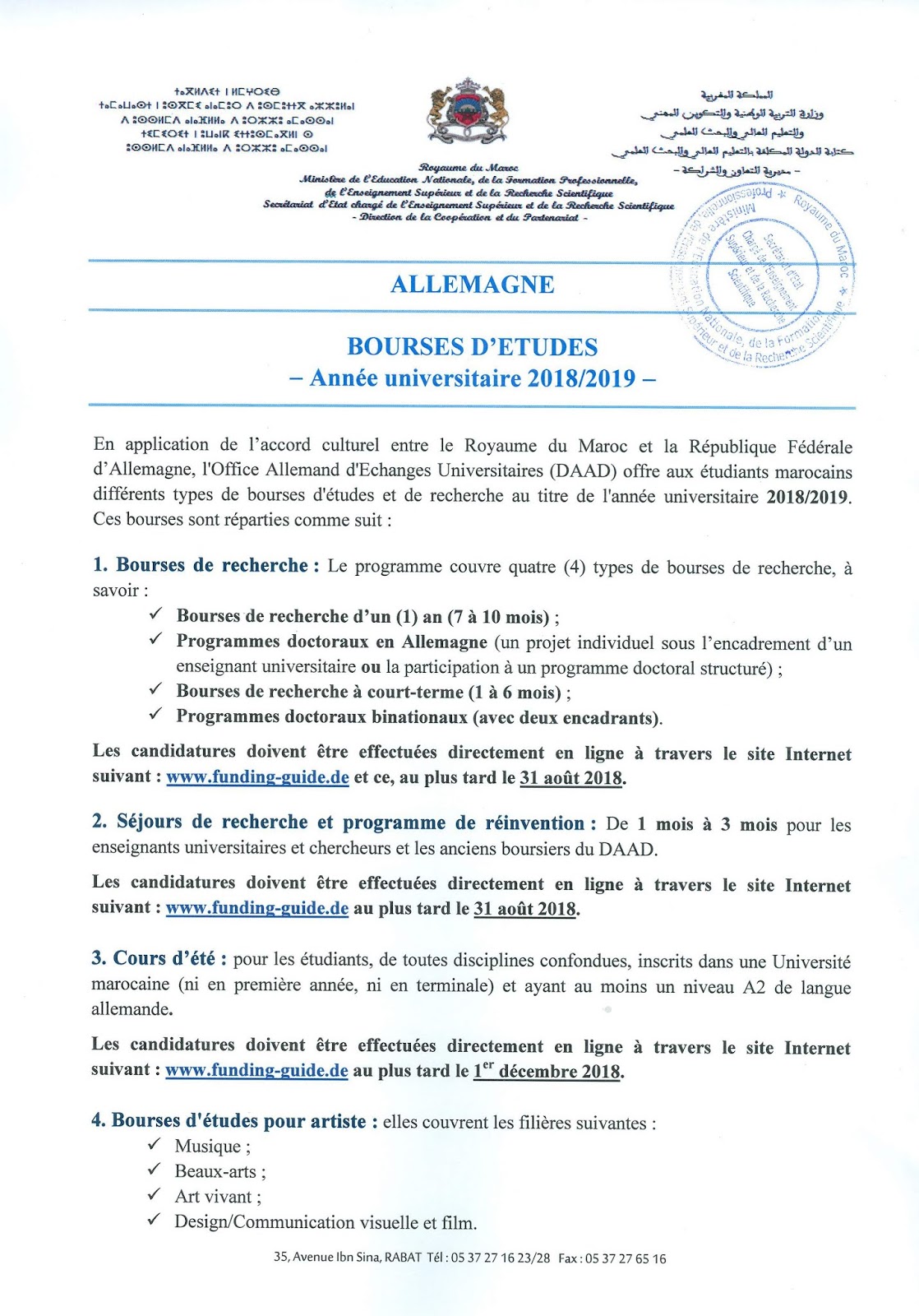 Alwadifa Maroc / Autres offres d'emploi / Bourses d'études / Emploi public / Offre d'emploi maroc ألمانيا: منح الدراسة برسم السنة الجامعية 2019/2018 ShareSharePin It ألمانيا: منح الدراسة برسم السنة الجامعية 2019/2018 Allemagne_Note_informations