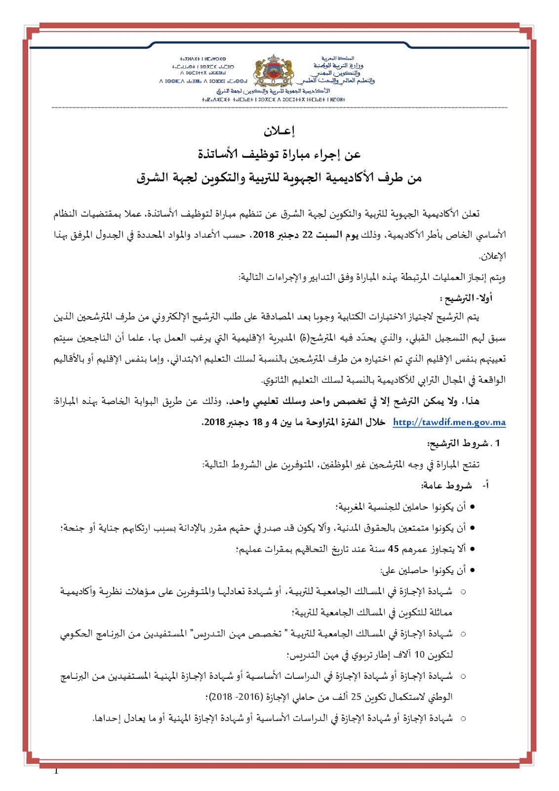 Alwadifa Guercif / Alwadifa licence / Alwadifa Maroc / Alwadifa Oujda / Alwadifa TAALIM / Autres offres d'emploi / Ministère de l'éducation / Offres d'emploi Licence / Par fonction / Par ministere / Par ville الأكاديمية الجهوية للتربية والتكوين لجهة الشرق مباراة توظيف 1273 أستاذ(ة) آخر أجل هو 18 دجنبر 2018 ShareSharePin It الأكاديمية الجهوية للتربية والتكوين لجهة الشرق مباراة توظيف 1273 أستاذ(ة) آخر أجل هو 18 دجنبر 2018