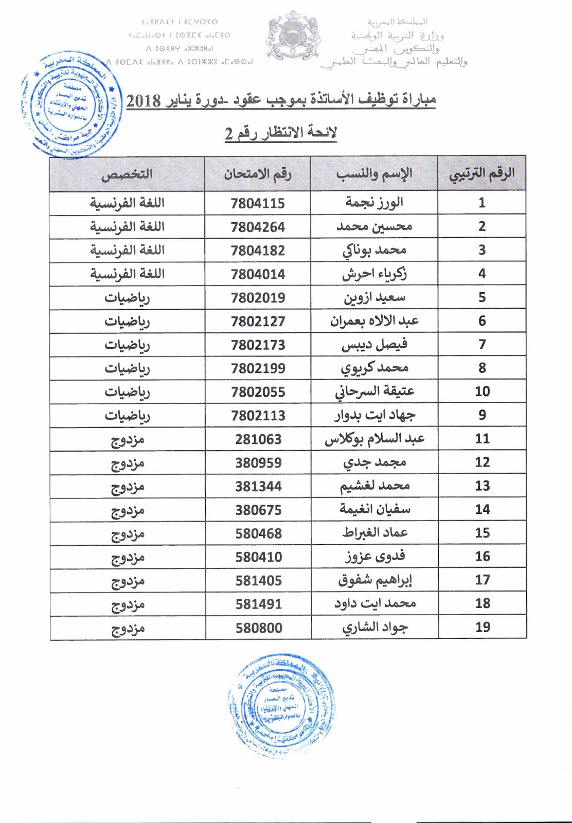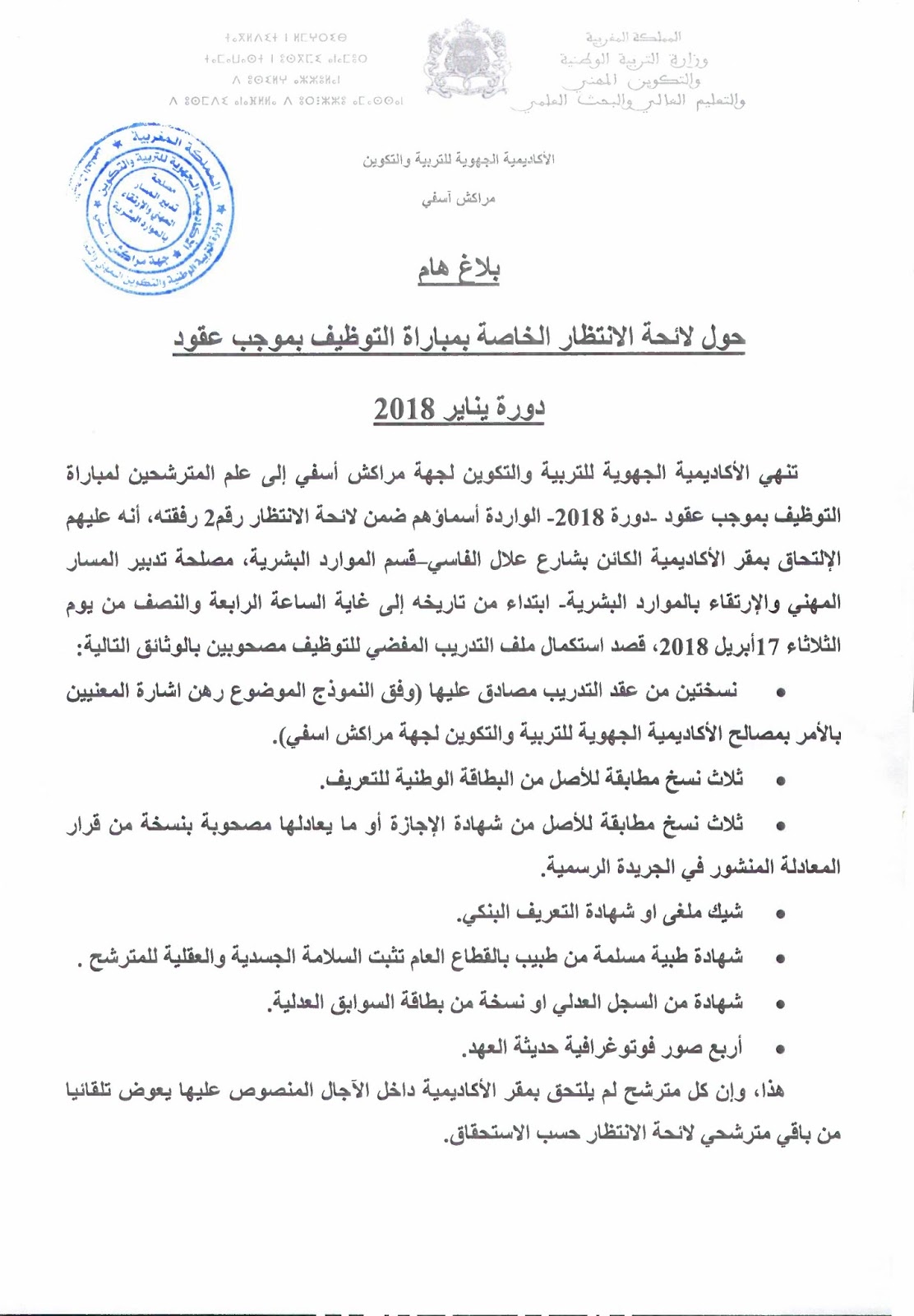 Alwadifa Maroc / Alwadifa Marrakech / Alwadifa Safi / Alwadifa TAALIM / Autres offres d'emploi / Par ville / Resultats du concours الأكاديمية الجهوية للتربية والتكوين لجهة مراكش أسفي لائحة الانتظار رقم (2) لمباراة التوظيف بالتعاقد دورة 2018 ShareSharePin It الأكاديمية الجهوية للتربية والتكوين لجهة مراكش أسفي لائحة الانتظار رقم (2) لمباراة التوظيف بالتعاقد دورة 2018