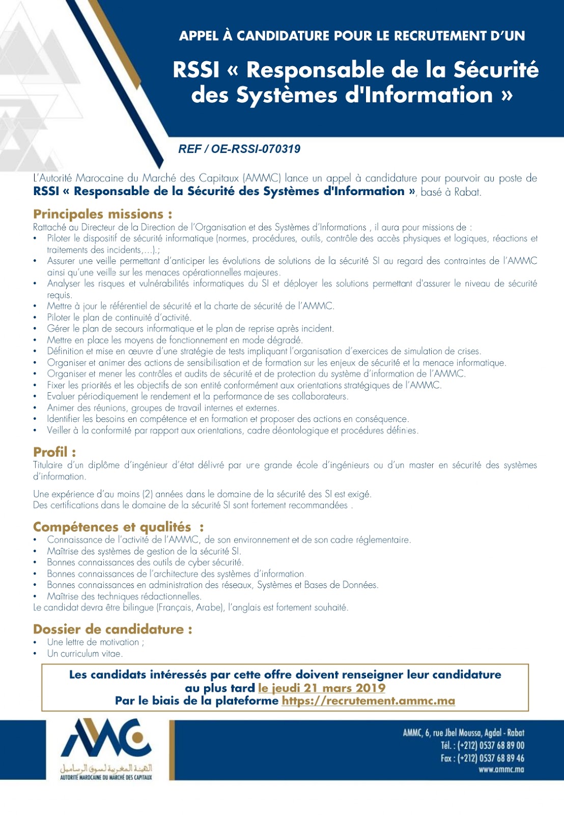 Alwadifa Maroc / Alwadifa tout le Maroc / Emploi diplomés / Etablissement Public / Par fonction / Par ville / Type الهيئة المغربية لسوق الرساميل مباراة لتوظيف 01 مسؤول عن أمن النظم المعلوماتية آخر أجل 21 مارس 2019 ShareSharePin It الهيئة المغربية لسوق الرساميل مباراة لتوظيف 01 مسؤول عن أمن النظم المعلوماتية آخر أجل 21 مارس 2019 نص الاعلان