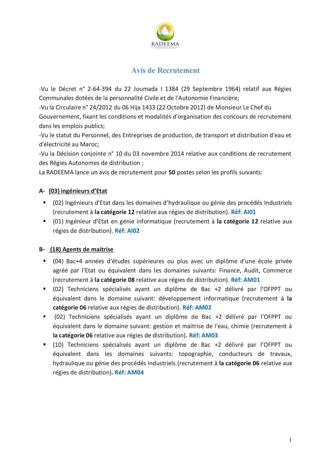 Alwadifa Maroc / Alwadifa Marrakech / Emploi diplomés / Offres d'emploi RADEE / Par fonction / Par ville / Type الوكالة المستقلة لتوزيع الماء والكهرباء بمراكش : مباراة توظيف 29 عون تنفيذ آخر أجل هو 28 شتنبر 2018 ShareSharePin It الوكالة المستقلة لتوزيع الماء والكهرباء بمراكش : مباراة توظيف 29 عون تنفيذ آخر أجل هو 28 شتنبر 2018