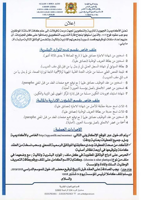 تخبر الأكاديمية الجهوية للتربية والتكوين لجهة سوس ماسة أنه يتعين على المتدربات والمتدربين بالمركز الجهوي لمهن التربية والتكوين لجهة سوس ماسة وفروعه الإقليمية فوج 2018 – استكمال ملفات توظيف تعاقدهم.