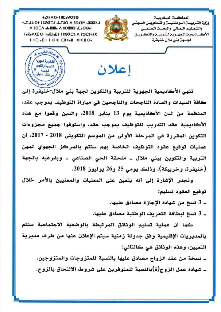 إعلان بخصوص ملف توظيف الأساتذة بموجب عقود فوج 2018