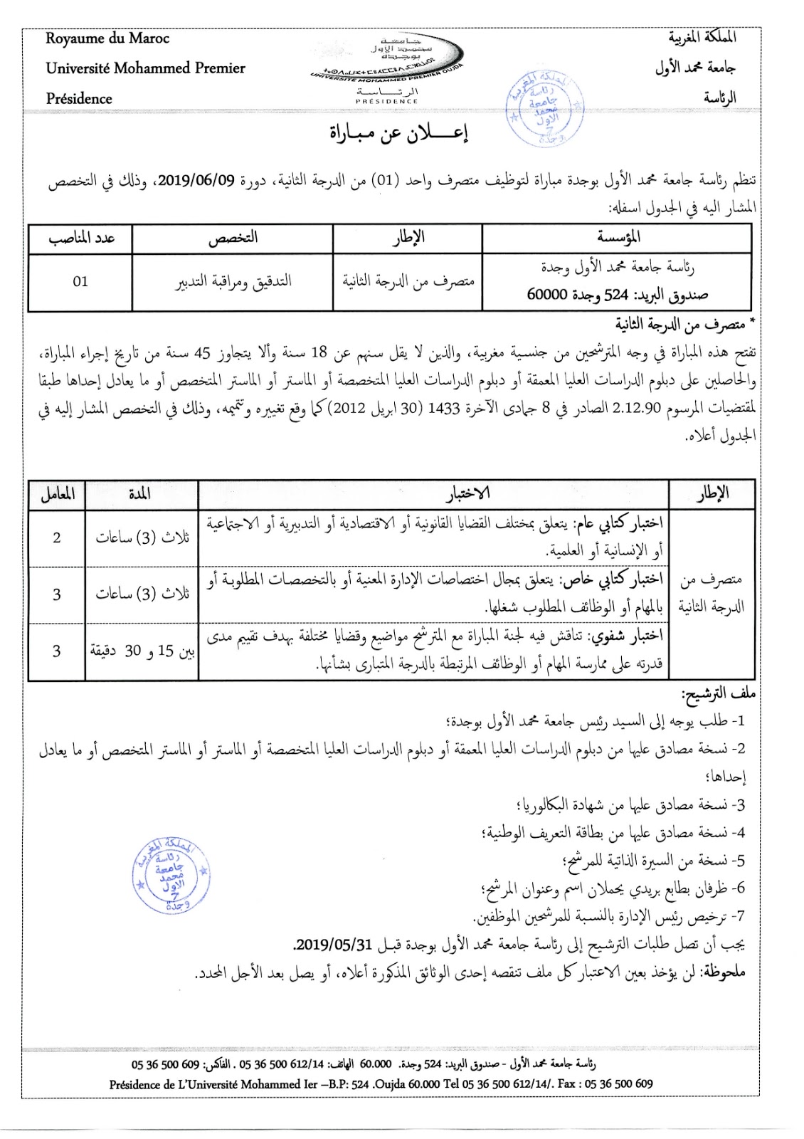 Alwadifa Maroc / Alwadifa master / Alwadifa Oujda / Autres offres d'emploi / Emploi public / Etablissement Public / Offre d'emploi maroc / Offres d'emploi master / Par fonction / Par ville / Type جامعة محمد الأول – وجدة مباراة لتوظيف متصرف من الدرجة الثانية تخصص التدقيق ومراقبة التدبير آخر أجل 31 ماي 2019 ShareSharePin It جامعة محمد الأول – وجدة مباراة لتوظيف متصرف من الدرجة الثانية تخصص التدقيق ومراقبة التدبير آخر أجل 31 ماي 2019 نص الاعلان