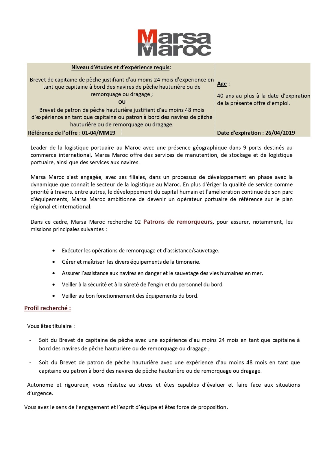 Alwadifa Maroc / Alwadifa tout le Maroc / Emploi diplomés / Emploi public / Marsa Maroc / Par fonction / Par ville / Type شركة استغلال الموانئ مرسى ماروك مباراة لتوظيف 02 قائد السفينة القاطرة آخر أجل 26 ابريل 2019 ShareSharePin It مرسى ماروك مباراة لتوظيف 02 قائد السفينة القاطرة آخر أجل 26 ابريل 2019 نص الاعلان