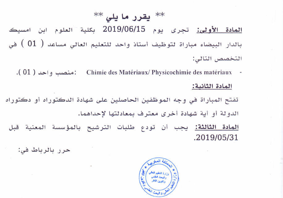 Alwadifa Casablanca / Alwadifa doctorat / Alwadifa Maroc / Autres offres d'emploi / Emploi public / Etablissement Public / Offre d'emploi maroc / Offre d'emploi maroc / Offre d’emploi Casablanca / Offres d'emploi doctorat / Par fonction / Par ville / Type كلية العلوم بن مسيك بالدار البيضاء مباراة لتوظيف أستاذ التعليم العالي مساعد الدرجة آخر أجل 30 ماي 2019 ShareSharePin It كلية العلوم بن امسيك بالدار البيضاء مباراة لتوظيف أستاذ التعليم العالي مساعد الدرجة آخر أجل 30 ماي 2019 نص الاعلان