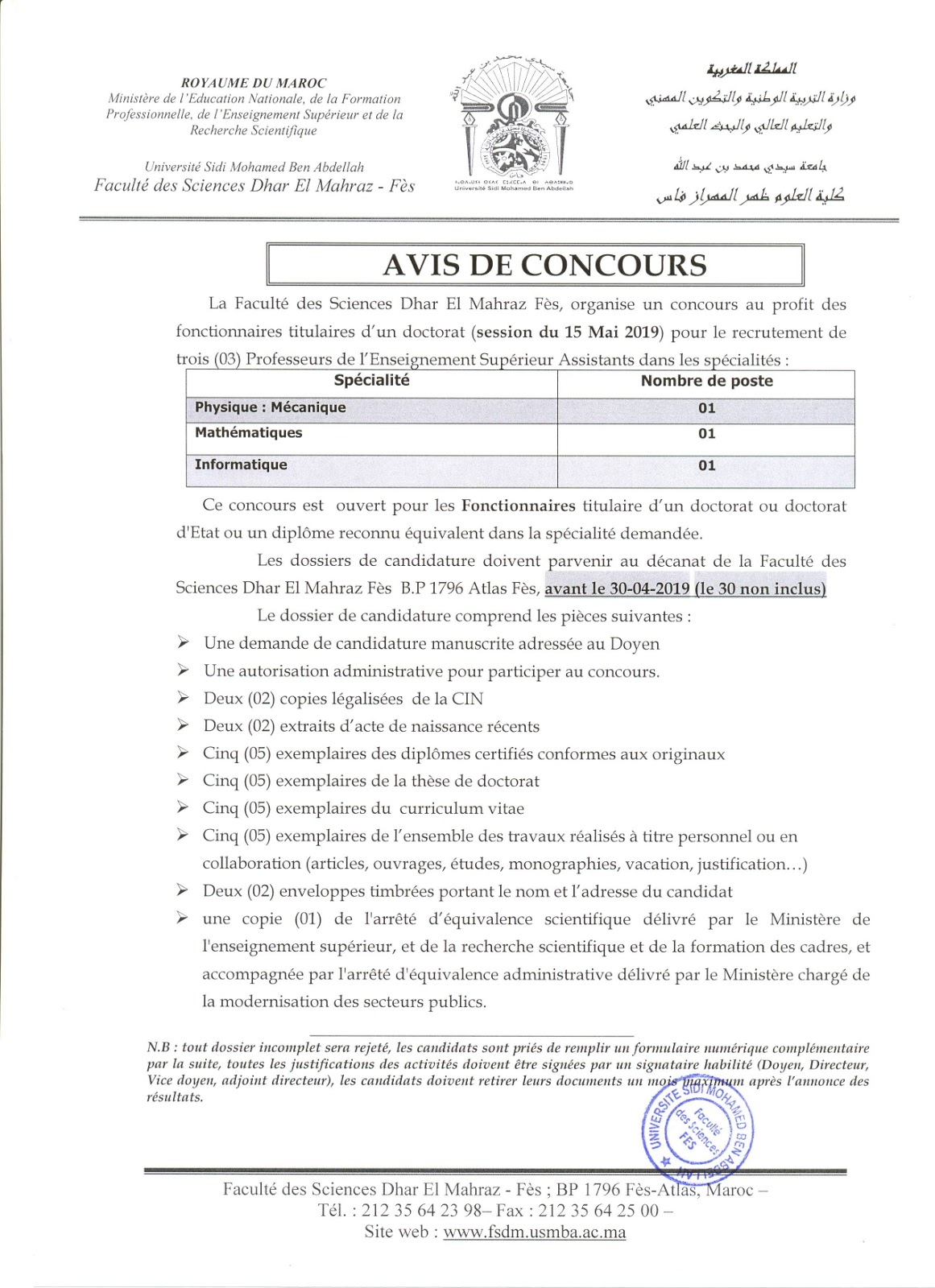 كلية العلوم ظهر المهراز فاس مباراة لتوظيف 03 أساتذة التعليم العالي مساعدين آخر أجل 30 ابريل 2019