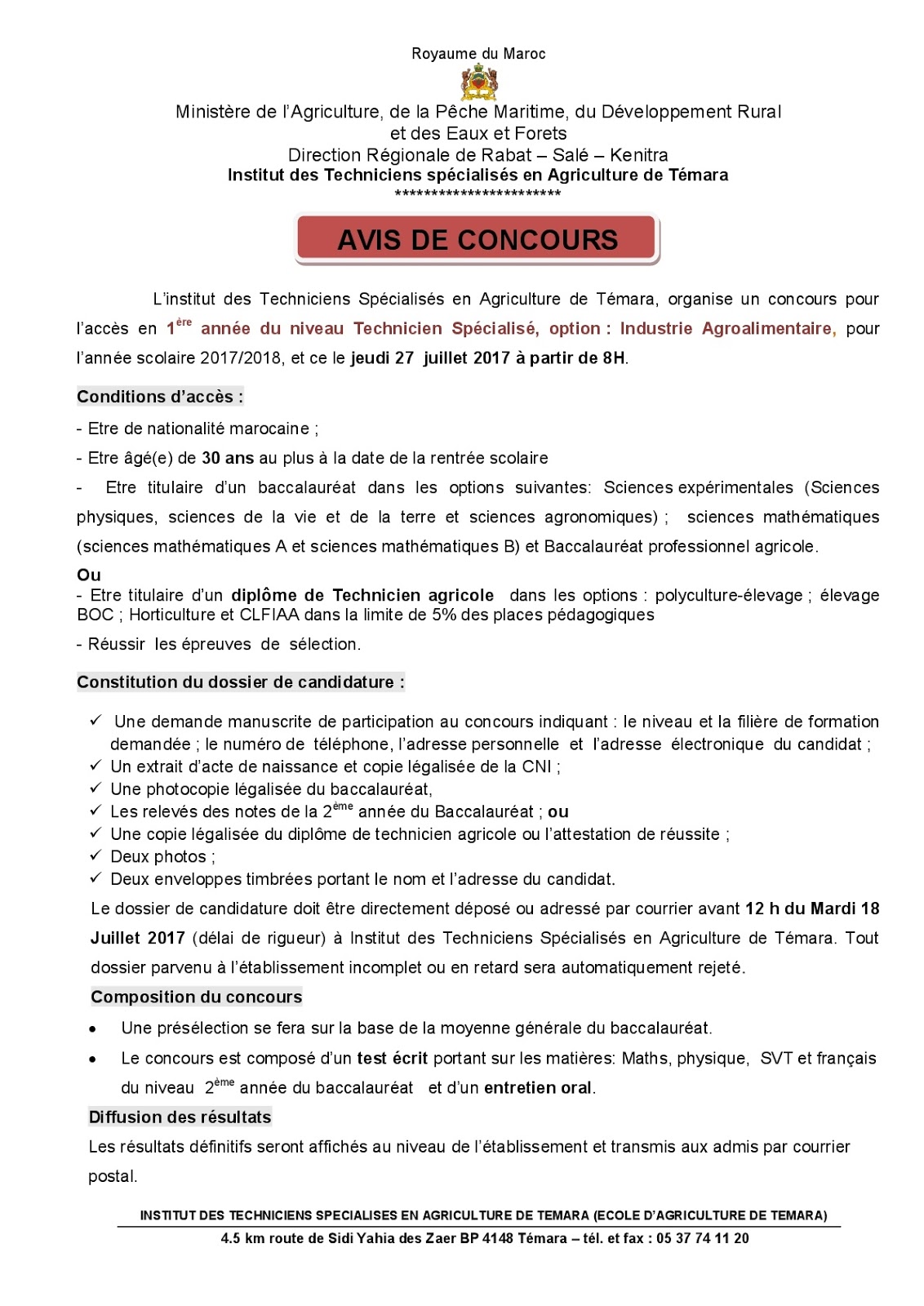 Alwadifa Maroc / Alwadifa technicien / Autres offres d'emploi / Par ville / Voir les autres villes معهد التقنيين المتخصصين في الفلاحة بتمارة مباراة ولوج مستوى التقني متخصص 2017-2018 ShareSharePin It معهد التقنيين المتخصصين في الفلاحة بتمارة مباراة ولوج مستوى التقني متخصص 2017-2018