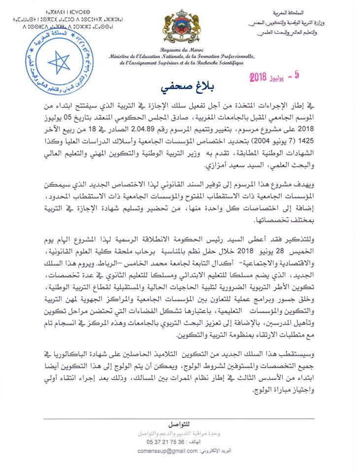 وزارة التربية الوطنية بلاغ هام للحاصلين على البكالوريا الراغبين في ولوج الإجازة في التربية – تخصص التعليم الإبتدائي
