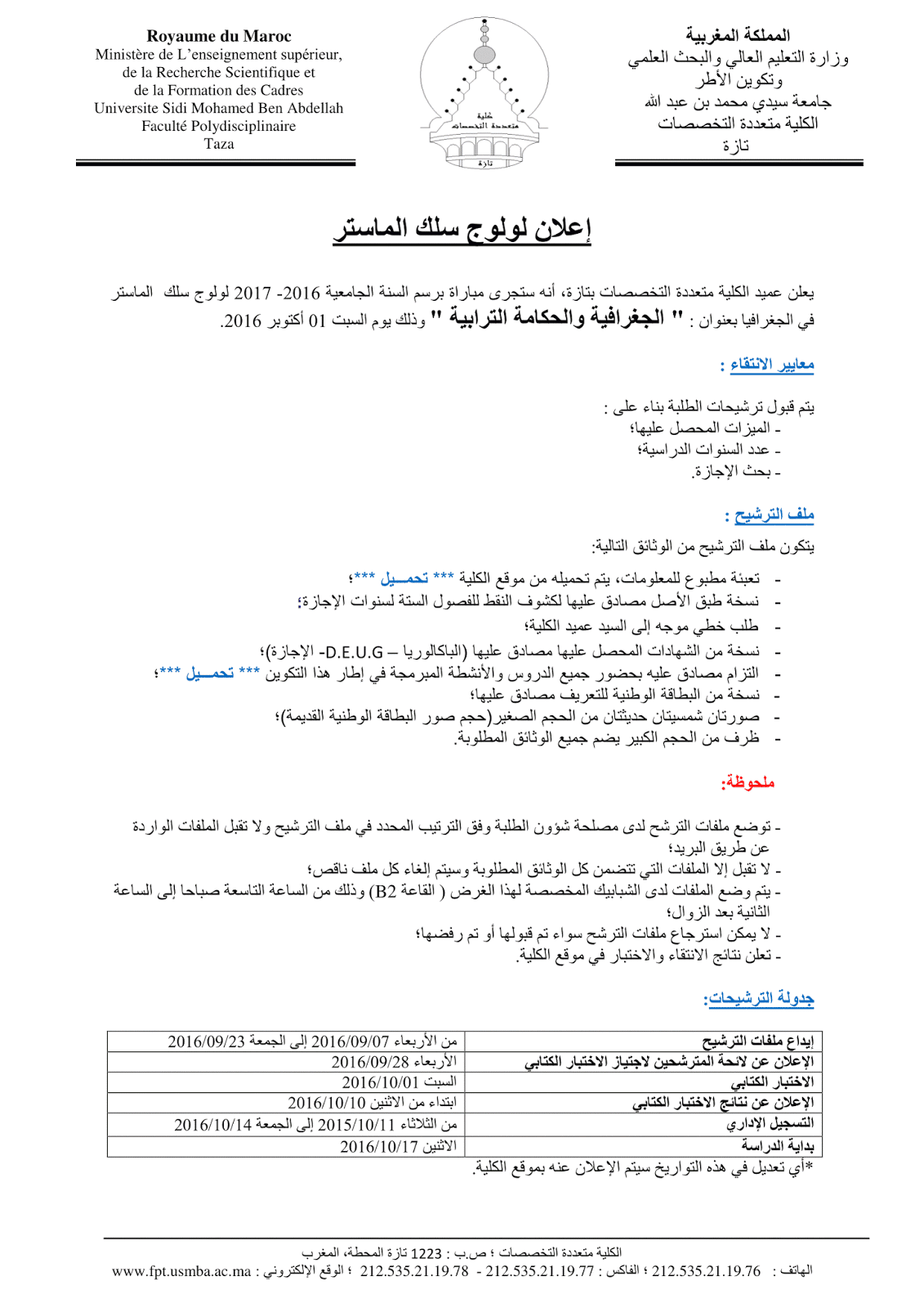 يعلن عميد الكلية متعددة التخصصات بتازة، أنه ستجرى مباراة برسم السنة الجامعية 2016- 2017 لولوج ماسترالجغرافية والحكامة الترابية وذلك يوم السبت 01 أكتوبر 2016.