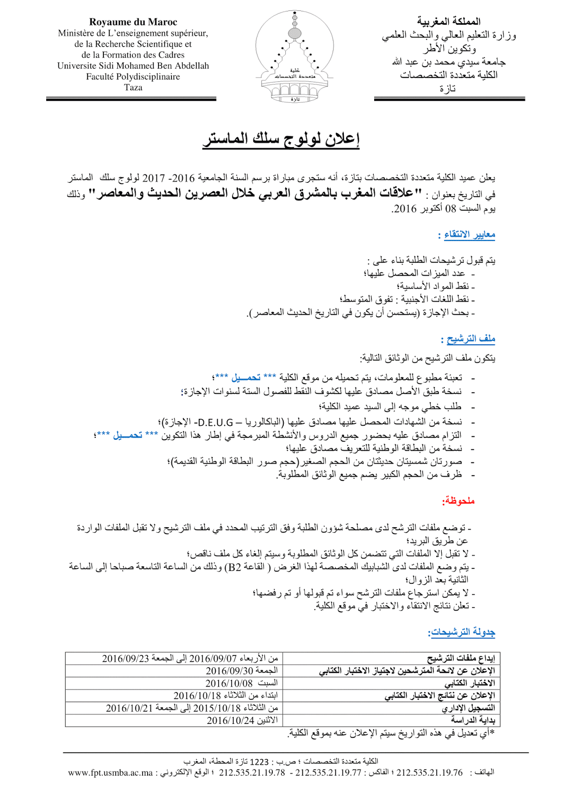إعلان لولوج سلك ماسترعلاقات المغرب بالمشرق العربي خلال العصرين الحديث والمعاصر بالكلية متعددة التخصصات بتازة 2017/2016