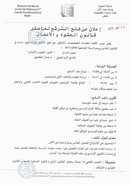 Alwadifa Maroc / Alwadifa master / Alwadifa Nador / Autres offres d'emploi / Offre d'emploi maroc / Offres d'emploi master / Par fonction / Par ville وظائف ماستر قانون العقود والأعمال 2016/2017 بالكلية المتعددة التخصصات بالناظور ShareSharePin It ماستر قانون العقود والأعمال 2016/2017 بالكلية المتعددة التخصصات بالناظور الكلية المتعددة التخصصات الناظور ماستر قانون العقود والأعمال تحميل الإعلان. تحميل بطاقة المترشح.