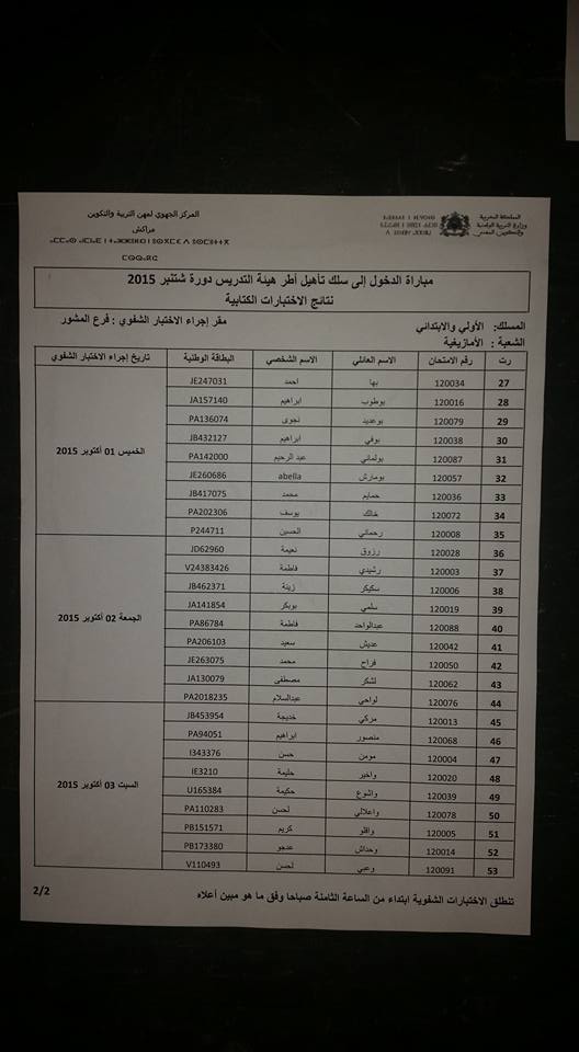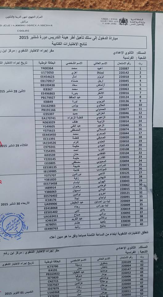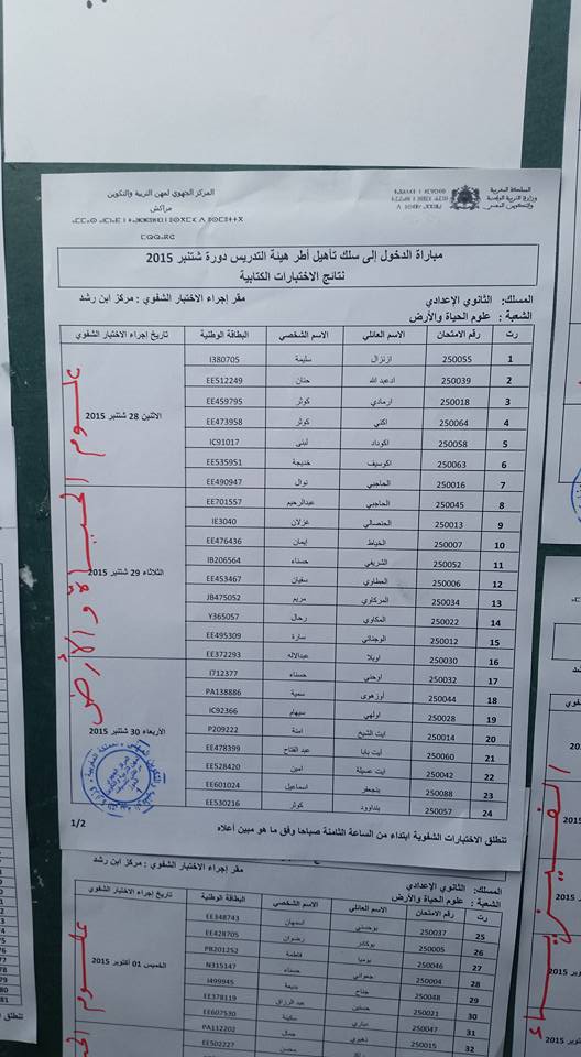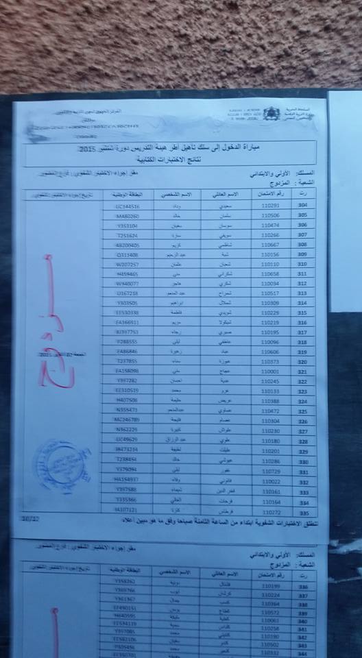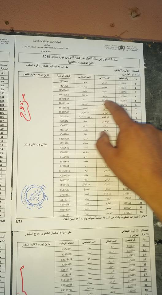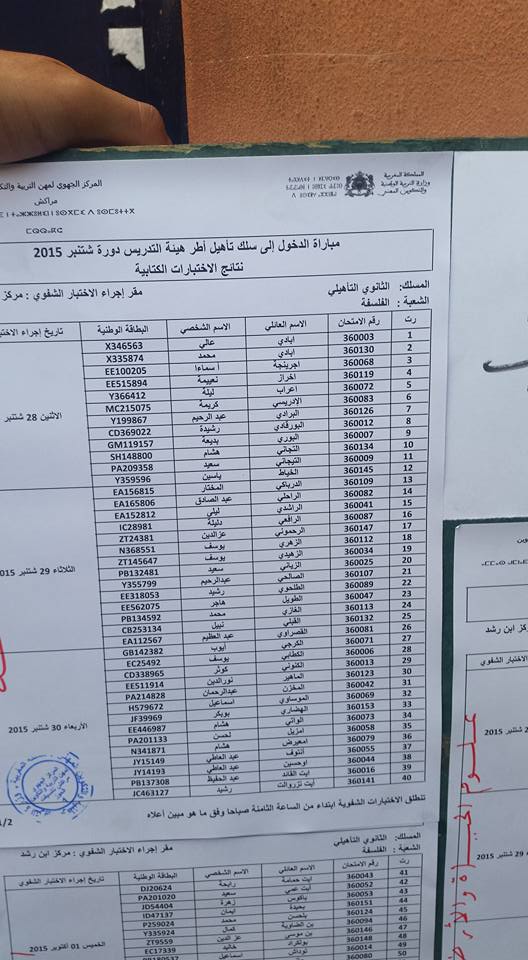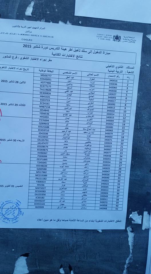 Alwadifa Marrakech / Par ville / Resultats du concours وظائف مراكش نتائج الإمتحان الكتابي من مباراة ولوج المراكز الجهوية لمهن التربية والتكوين ShareSharePin It مراكش نتائج الإمتحان الكتابي من مباراة ولوج المراكز الجهوية لمهن التربية والتكوين 2015-2016 مراكش ـ جميع الشعب ثانوي تأهيلي مراكش ـ إعدادي التربية الإسلامية و- التربية البدنية مراكش الإبتدائي مراكش إبتدائي أمازيغية مراكش