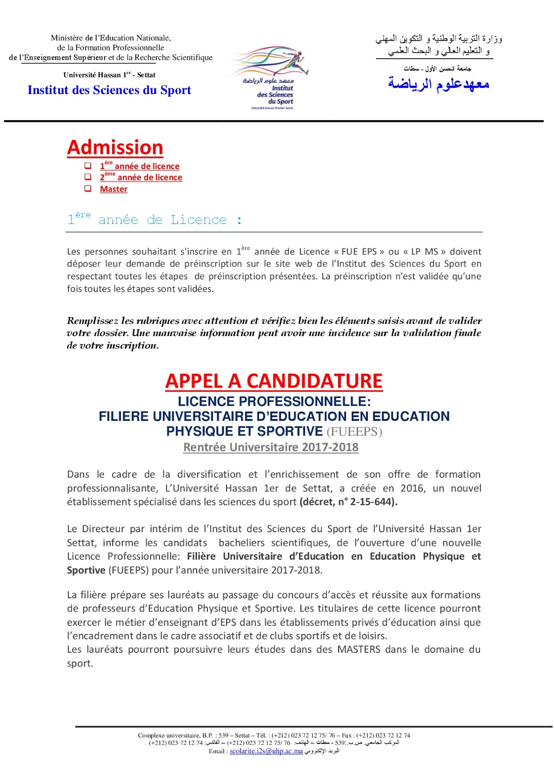 Alwadifa Maroc / Alwadifa Settat / Alwadifa TAALIM / Autres offres d'emploi / Licence professionnelle / Par ville وظائف معهد علوم الرياضة بسطات مباراة ولوج السنة الاولى من الاجازة المهنية في التربية البدنية و الرياضة آخر آجل 20 يوليوز ShareSharePin It معهد علوم الرياضة بسطات مباراة ولوج السنة الاولى من الاجازة المهنية في التربية البدنية و الرياضة آخر آجل 20 يوليوز 2017 للتسجيل اضغط هنا